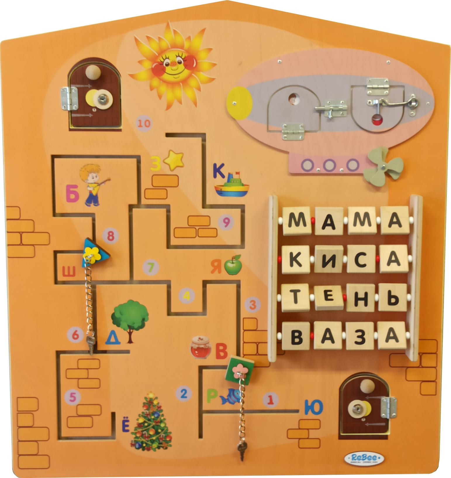Игра с бизибордом способствует развитию мелкой моторики детских рук, развитию наглядно-образного и логического мышления, координации, запоминанию цветов и фактур, помогает ребёнку развивать причинно-следственные связи.
