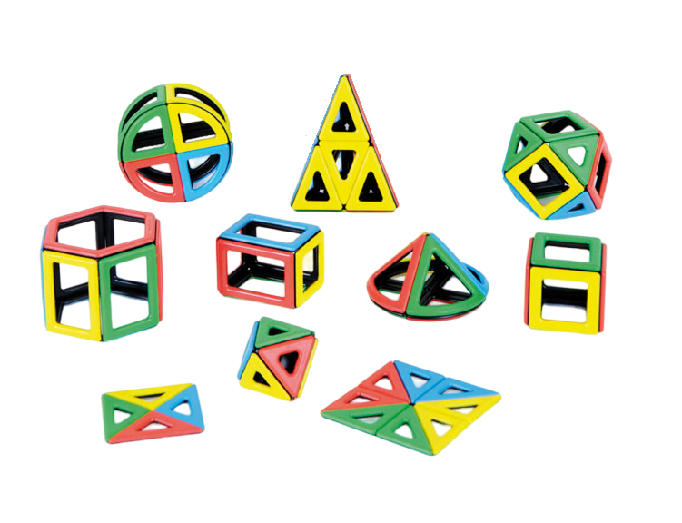 Состав набора: 20 равносторонних треугольников, 12 прямоугольных треугольников, 12 равнобедренных треугольников, 20 квадратов, 10 прямоугольников, 12 пятиугольников, 4 шестиугольника, 8 сферических частей, 12 четвертей круга, 4 части конуса и 4 части цилиндра.