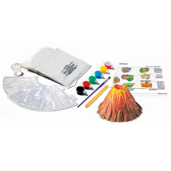 В комплекте: форма для вулкана, гипсовый порошок, палочка для перемешивания, краски 6ти цветов, кисть, рисунки для украшения вулкана, инструкция.