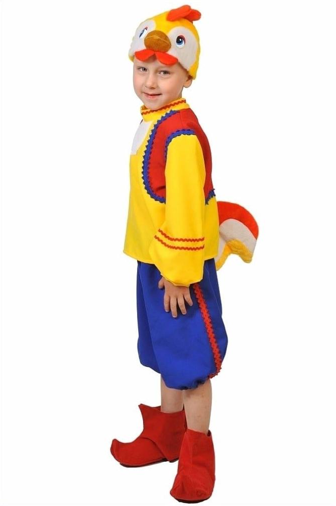 Красочный костюм Петушка включает все необходимое для создания выразительного образа одного из главных сказочных героев: шапочку-маску, яркую рубашку, темные бриджи, пестрый жилетик, сапожки с загнутыми носками, а также разноцветный хвост.