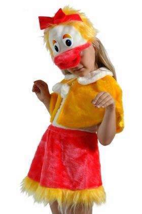 Комплект из оранжевой пелерины, красной юбочки и маски-шапочки с красным бантом добавит колорита любой утиной истории или карнавалу.