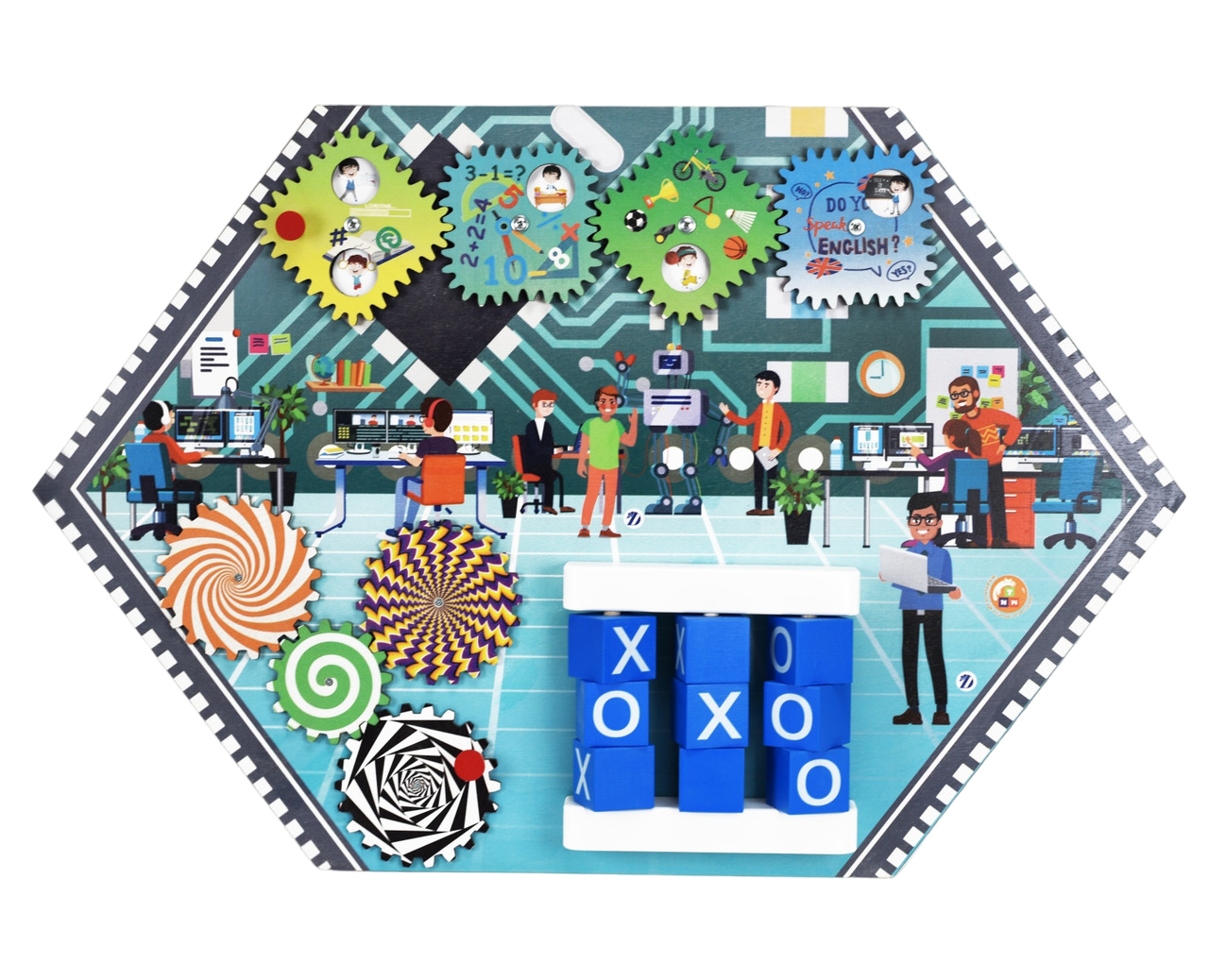 2. Система взаимосвязанных квадратных шестеренок «Что должен знать и уметь программист?» позволяет наглядно объяснить ребенку, что для того, чтобы стать хорошим программистом нужно отлично знать математику и английский язык, а также заниматься спортом.