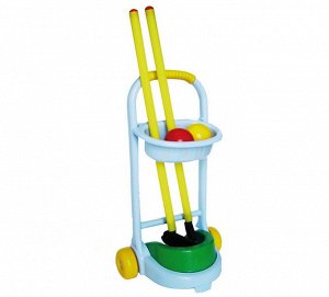 В наборе: 2 клюшки, 2 мячика, 3 лунки, 1 тележка.