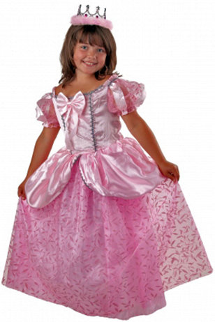 Сам костюм - это собственно роскошное платье розового цвета с тонкой отделкой, украшенное бантом плюс важная деталь - корона, которая как ни странно гармонирует по цвету с платьем.