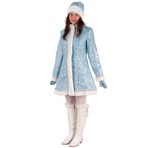 Голубой сантун имеет красивый узор зимнего рисунка, вшитый серебряными нитками. Отделан мехом и тесьмой.